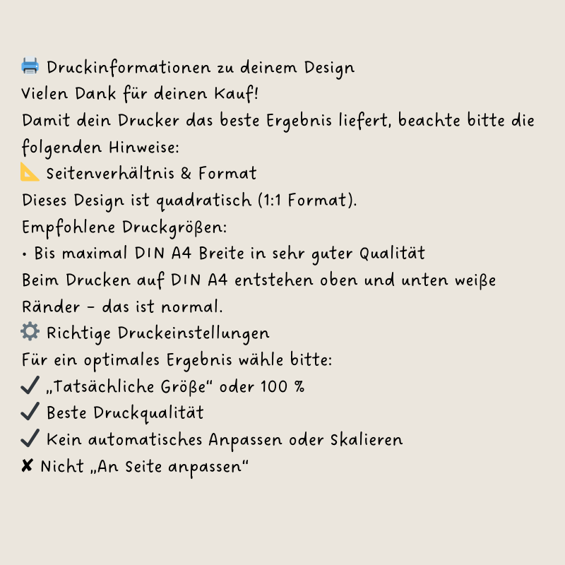 Format *.pdf: Dieses Dokument ist dein druckfertiges Format im quadratischen 1:1 Verhältnis. Es ist bereits für den direkten Ausdruck optimiert. Um das beste Ergebnis zu erzielen, wähle in den Druckeinstellungen bitte „Tatsächliche Größe“ oder „100 %“ sowie die Option „Seitenverhältnis beibehalten“. So verhinderst du eine ungewollte Verzerrung des Designs.