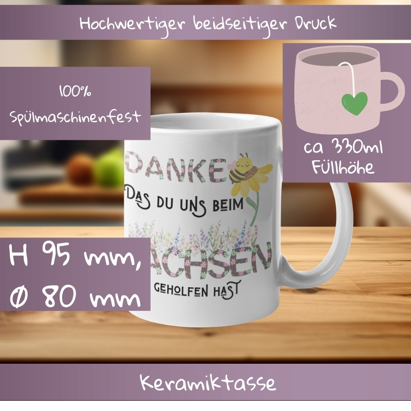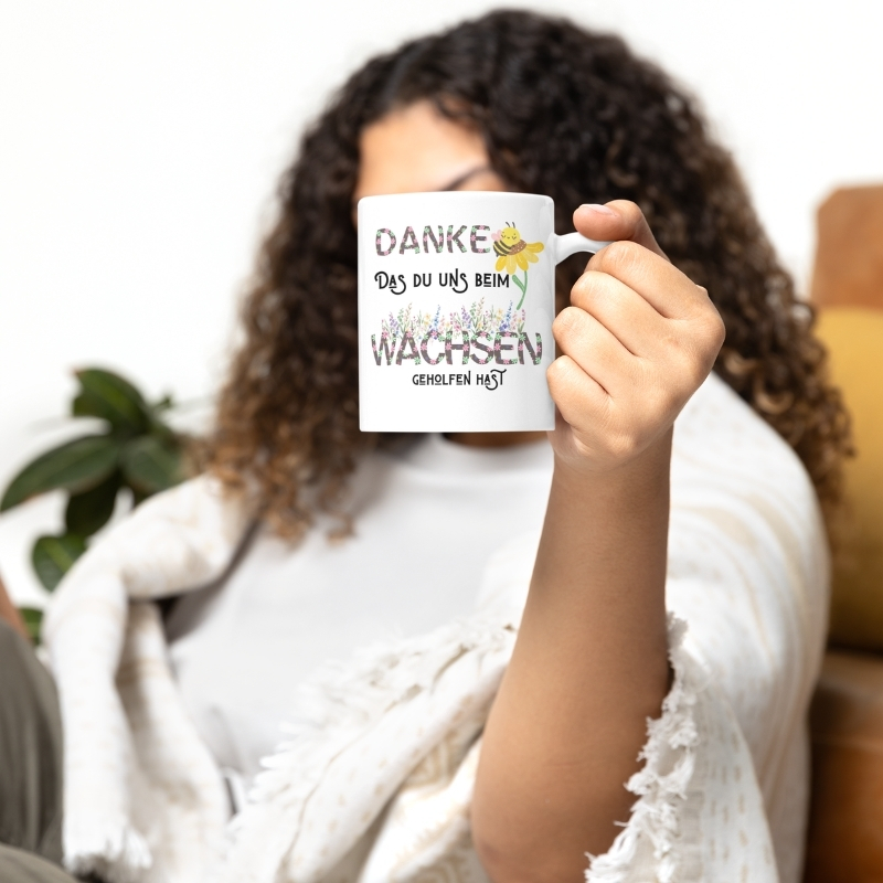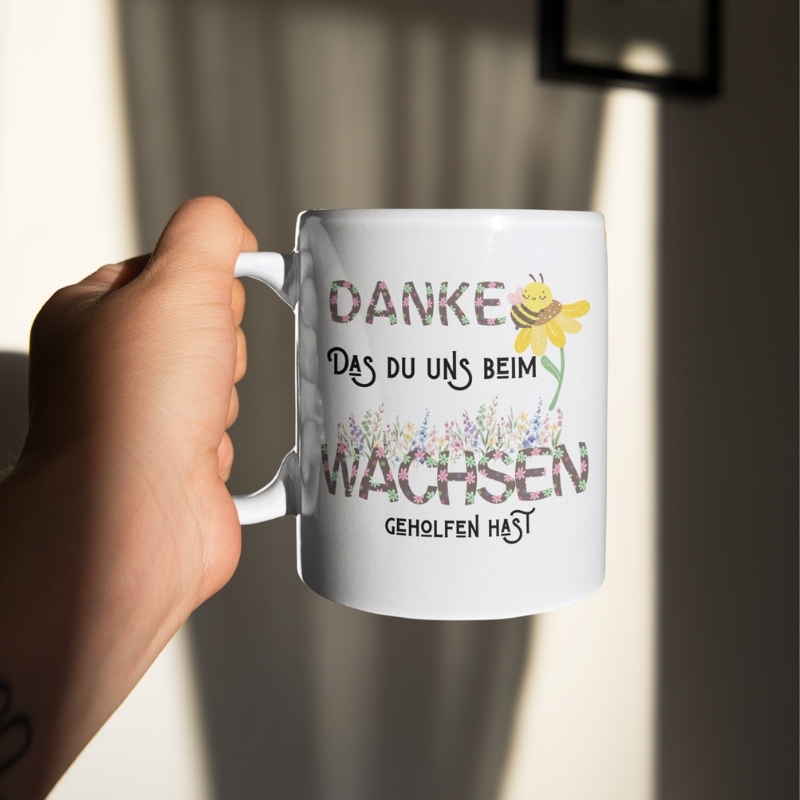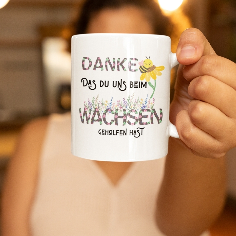 Eine Tasse, die mehr sagt als tausend Worte: Unser Modell mit dem herzlichen Spruch „Danke, dass du uns beim Wachsen geholfen hast“ ist das perfekte Symbol für Wertschätzung und Dankbarkeit.