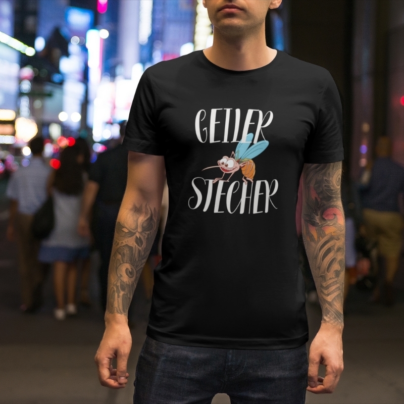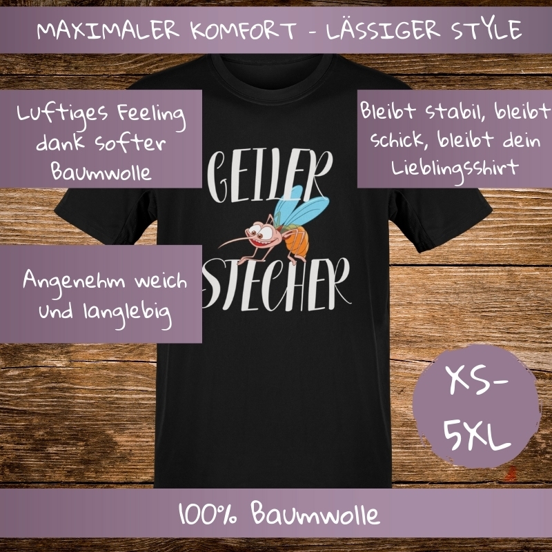 Bereichere deine Garderobe mit unserem „Geiler Stecher“ -Design T-Shirt. Hergestellt aus hochwertiger 100% Baumwolle bietet dieses T-Shirt nicht nur Komfort, sondern auch einen Hauch von Humor und Selbstbewusstsein. Das auffällige Moskito-Design ist ein Statement für alle, die ehrlich, authentisch und mit einem lächeln durchs Leben gehen.