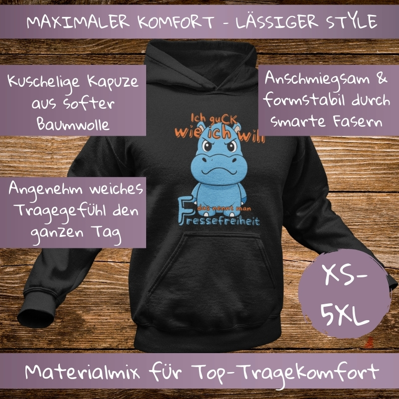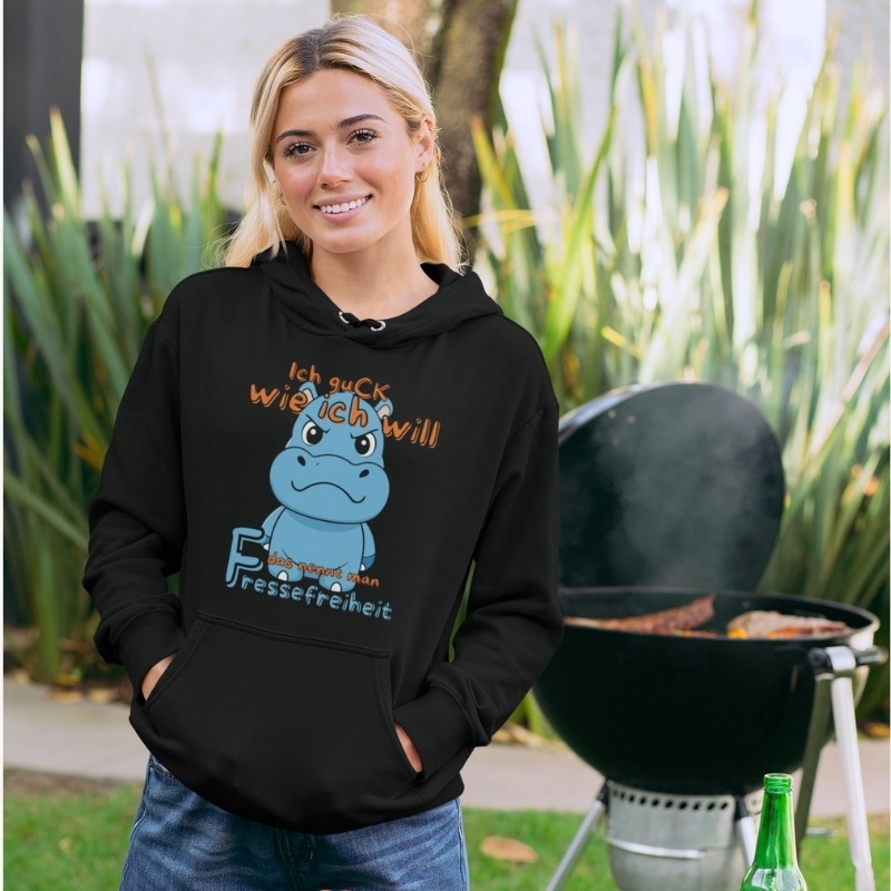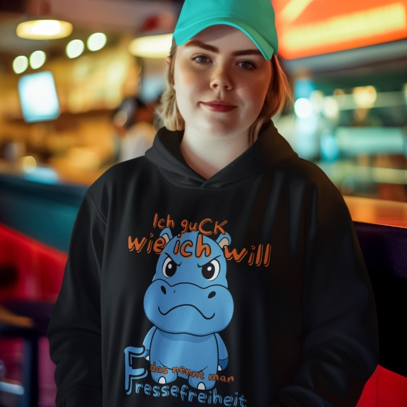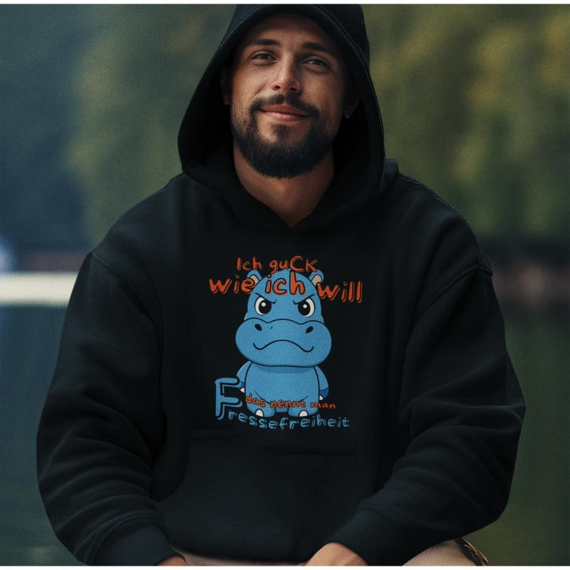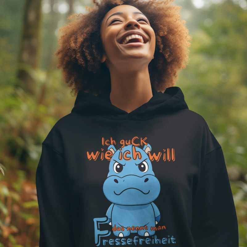 Dieser Hoodie mit dem herrlich schlecht gelaunten Nilpferd und dem Spruch „Ich guck wie ich will – das nennt man Fressefreiheit“ ist das ultimative Statement für alle, die auf Smalltalk verzichten können.