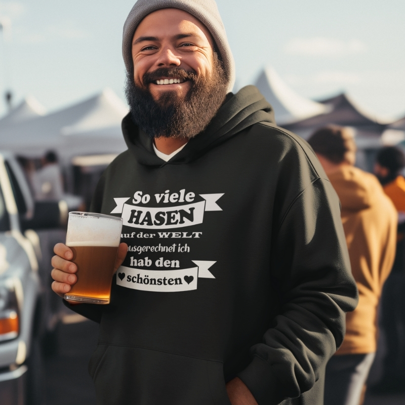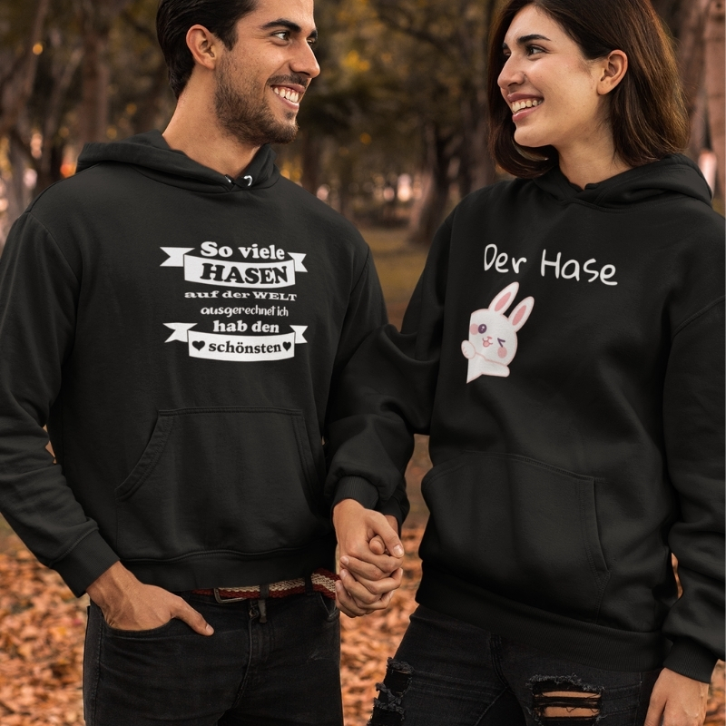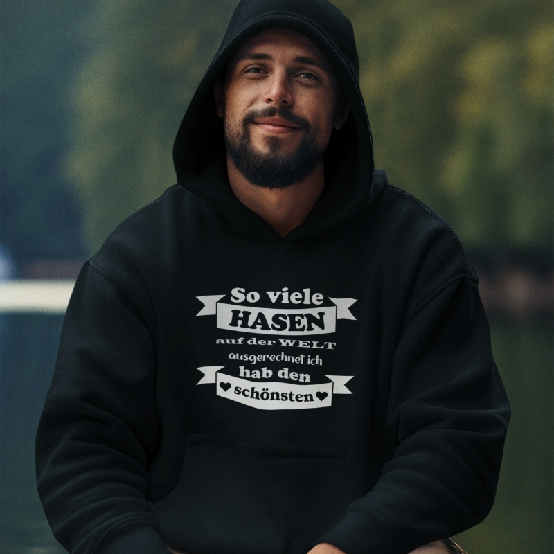 Hoodie mit dem charmanten Spruch „So viele Hasen auf der Welt – ausgerechnet ich hab den schönsten“ und einem zuckersüßen, zwinkernden Hasen-Motiv. Der perfekte Mix aus Liebeserklärung und einer ordentlichen Portion Humor, ein Hingucker als Partnerlook.