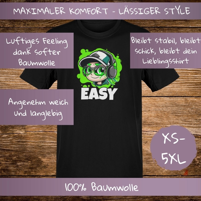 Tauche ein in die Welt des positiven Denkens mit unserem T-Shirt mit Spruch: Alles Easy! Hergestellt aus 100% Baumwolle bietet dir dieses T-Shirt nicht nur höchsten Tragekomfort, sondern auch eine Extraportion Spaß und Positivität für deinen Alltag.
