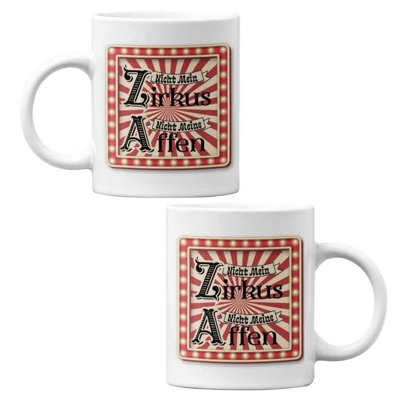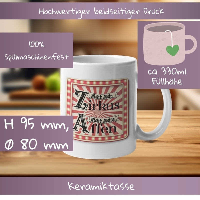 Beginnen wir den Tag mit einem Lächeln mit der Keramiktasse mit Spruch: Nicht mein Zirkus, nicht meine Affen. Diese Tasse hat eine Füllhöhe von 330ml, perfekt für Ihren morgendlichen Kaffee oder Tee. Der beidseitige Druck sorgt dafür, dass der Spruch von jedem gesehen werden kann, egal ob Sie Rechts- oder Linkshänder sind.