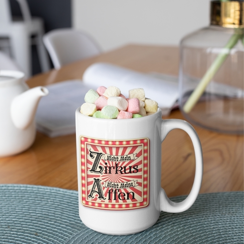 Erwecken Sie Ihre Kaffeepause zum Leben mit dieser einzigartigen Tasse und lassen Sie sich von dem Spruch inspirieren. Machen Sie sich selbst eine Freude oder überraschen Sie Ihre Lieben mit dieser idealen Geschenkidee. Genießen Sie Ihre Getränke mit Stil und Humor mit der Tasse mit Spruch: Nicht mein Zirkus, nicht meine Affen.