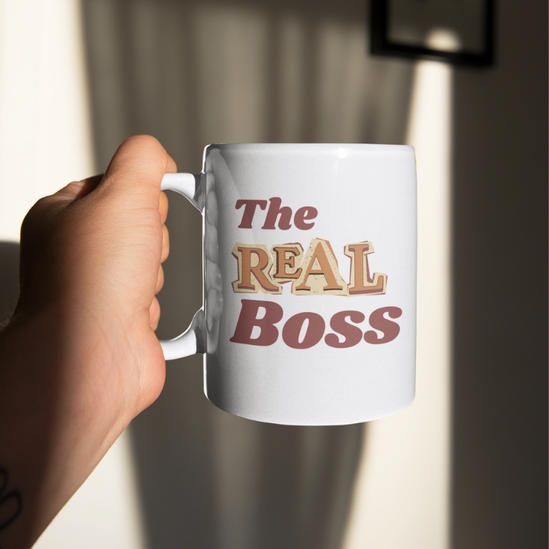 Kurz aufgedreht, Krone gerichtet, und dann erst Kaffee! Diese Tasse trägt den Statement-Schriftzug „THE REAL BOSS“ in coolen Retro-Lettern und macht klar: Hier trinkt jemand mit Haltung, Humor und ein bisschen Main-Character-Energie.