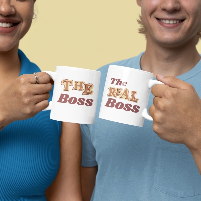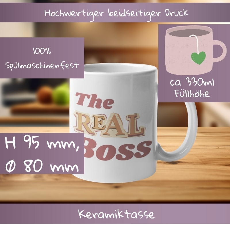 Zwei Tassen, zwei Statements, ein augenzwinkernder Machtkampf: Während „THE BOSS“ cool und souverän wirkt, setzt „The REAL Boss“ noch eins drauf, liebevoll frech und herrlich eindeutig.